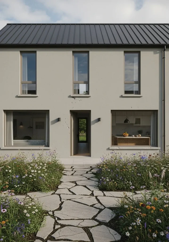 This two-story home embraces a contemporary aesthetic with a smooth, stucco-like exterior finished in a calm, mid-tone gray. The architecture is defined by tall, symmetrical windows and a central doorway that offers a glimpse straight through to the backyard greenery. A dark metal roof provides a sharp, structural cap to the design, while a whimsical flagstone path winds through a wild, flowering meadow of lavender and daisies. This juxtaposition of rigid building lines and organic, flowing landscaping creates a balanced look that feels both professional and peaceful.
