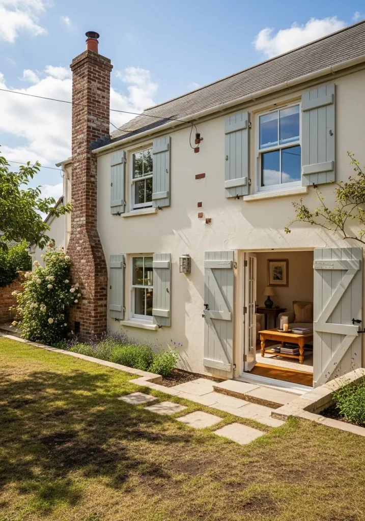 This enchanting cottage exterior features a smooth cream finish that glows beautifully under a clear blue sky. The architecture is defined by a tall brick chimney and classic wooden shutters painted in a soft sage green, which adds a lovely pop of color against the pale walls. Wide French doors open directly onto a stone patio, creating a seamless connection between the cozy interior living space and the sun-dappled lawn. It is a quintessential example of how a warm white can make a traditional home feel light, airy, and full of vintage charm.