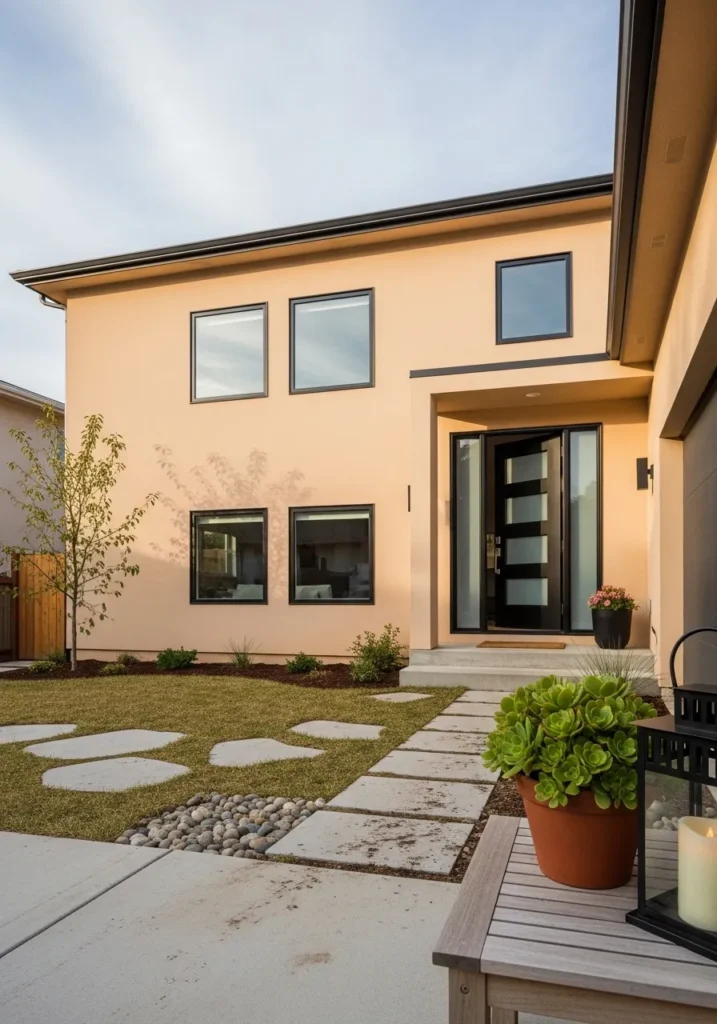 This contemporary two-story home features a smooth stucco exterior in a unique peachy-beige that glows beautifully as the sun begins to set. The architecture is defined by sharp geometric lines and a recessed entryway that houses a stunning black front door with frosted glass panels. To balance the warm wall color, the design incorporates a clean concrete walkway and stepping stones set into a manicured lawn, along with low-maintenance succulents and river rocks. Large square windows with thin black frames keep the look minimalist while allowing plenty of natural light to flood the interior.