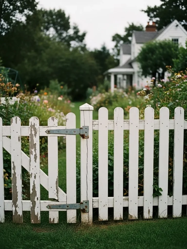 This fence features a classic white picket gate with visible wear and peeling paint that shows its age beautifully. The hardware feels sturdy and simple while the uneven paint adds texture and depth. Behind the gate sits a lush garden filled with flowers and greenery that feels slightly untamed. A cozy cottage home in the distance completes the soft countryside mood.