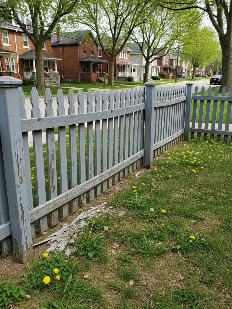 This fence uses tall pickets painted in a muted gray tone that blends effortlessly with the surrounding neighborhood. The finish shows signs of age with peeling areas near the base and subtle texture throughout. Mature trees and brick homes in the background add to the relaxed and lived in feel of the space.
