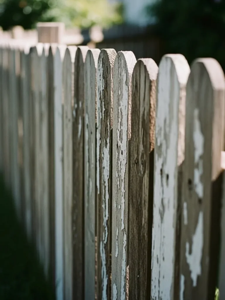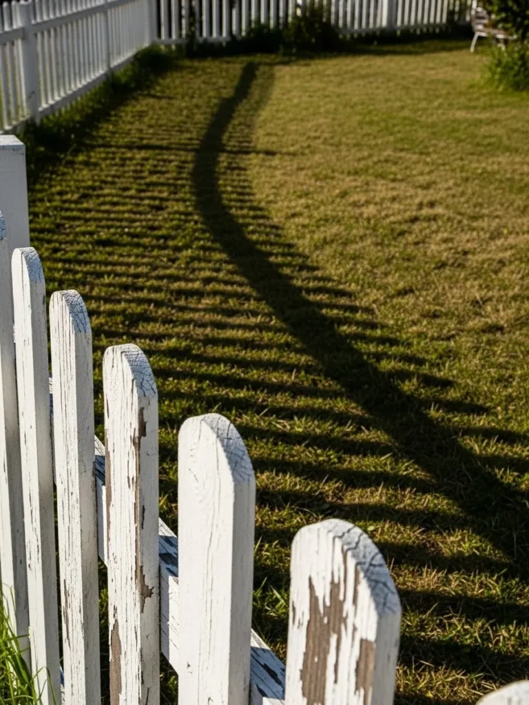 This fence shows off narrow white pickets with peeling paint and visible wear along the edges. The surface texture tells a story of sun, rain, and time. Long shadows stretch across the lawn, creating beautiful patterns that shift as the day goes on. The fence curves gently, keeping the look soft and informal.
