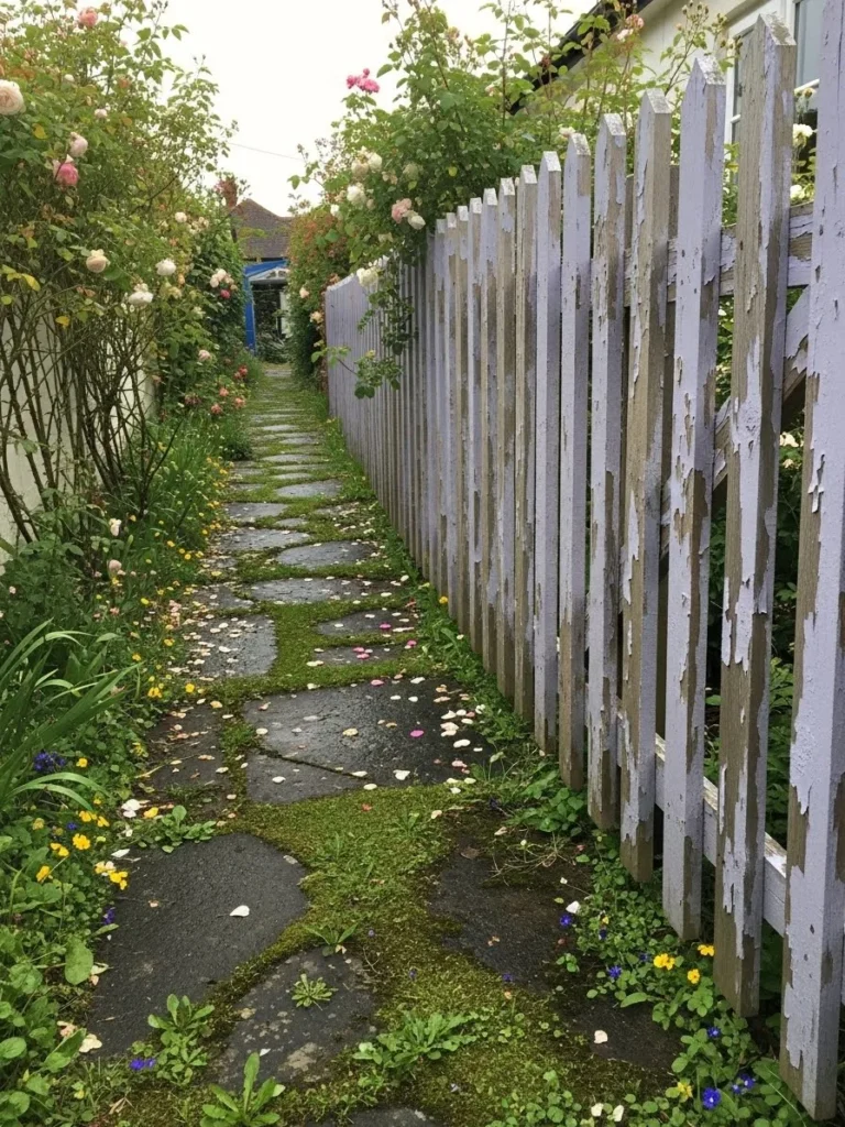 This fence features tall pickets painted in a soft lavender gray tone with plenty of visible wear. The paint is chipped and faded in places which adds layers of texture. A narrow stone path runs alongside it with flowers and greenery growing freely around the edges.