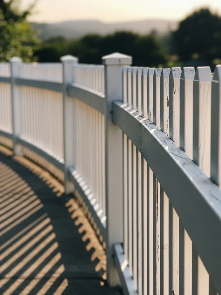 This fence features classic white pickets gently curving along a paved path. The paint shows light wear with tiny chips that add texture instead of looking messy. Tall posts anchor the curve and give the fence a sense of rhythm. Sunlight casts long repeating shadows that make the whole scene feel calm and unhurried.