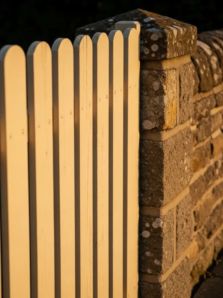 This design blends smooth white pickets with a weathered stone wall for a beautiful contrast. The rounded tops of the pickets feel gentle next to the rough stone texture. Warm light gives the white paint a soft glow and highlights small imperfections in the wood.