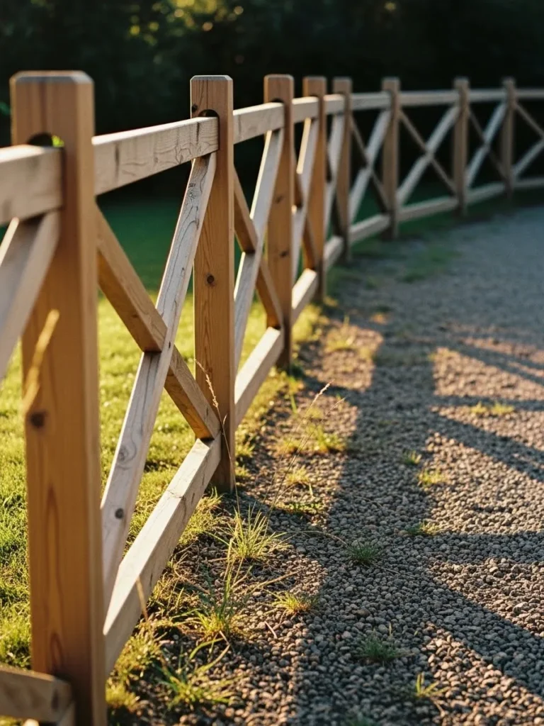This fence uses natural wood with simple cross rail details that create a casual countryside feel. The warm wood tones look beautiful against the gravel path and soft greenery around it. The structure feels sturdy but still relaxed which makes it perfect for open cottage style landscapes. Sunlight hitting the wood adds even more warmth.