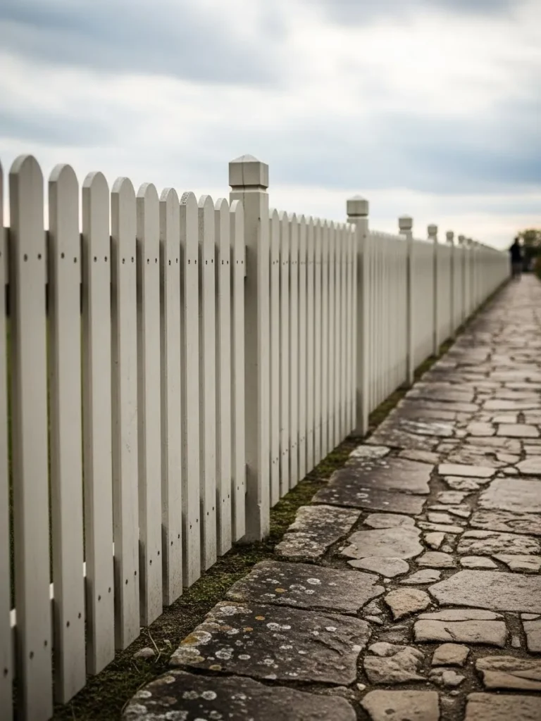 This classic white picket fence stretches along a stone path with evenly spaced posts and clean lines. The tall vertical pickets add structure while still keeping the look light and airy. The soft neutral tone works beautifully with the natural stone underfoot and the open sky above.