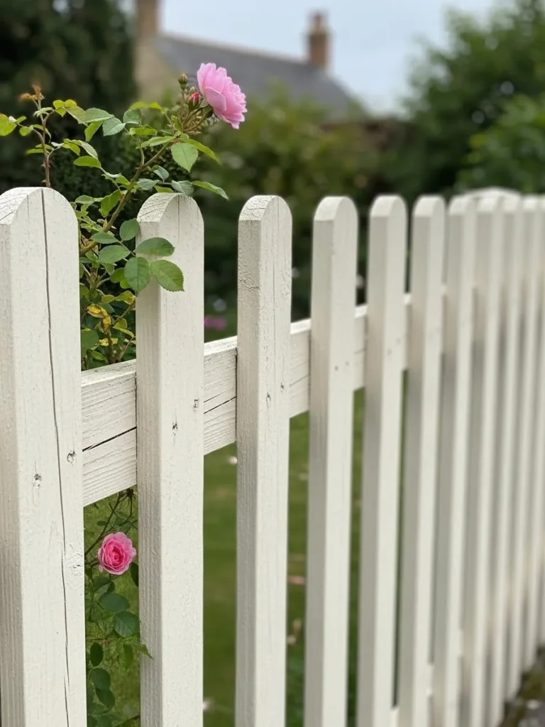 This design shows a traditional white picket fence with rounded tops and a smooth soft finish. A climbing rose peeks through the slats adding height and romance without overwhelming the structure. The spacing between pickets feels light and airy which keeps the fence from feeling heavy or closed off. Everything looks well cared for but still natural.