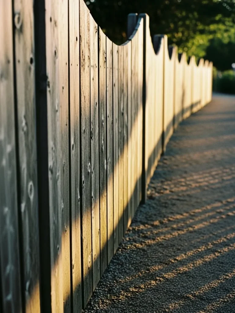 This fence features natural wood planks with a soft wave along the top edge that follows the curve of the path. The wood shows subtle weathering and texture which adds depth and character. Golden sunlight creates long shadows across the gravel path beside it making the whole scene feel peaceful and slow paced.