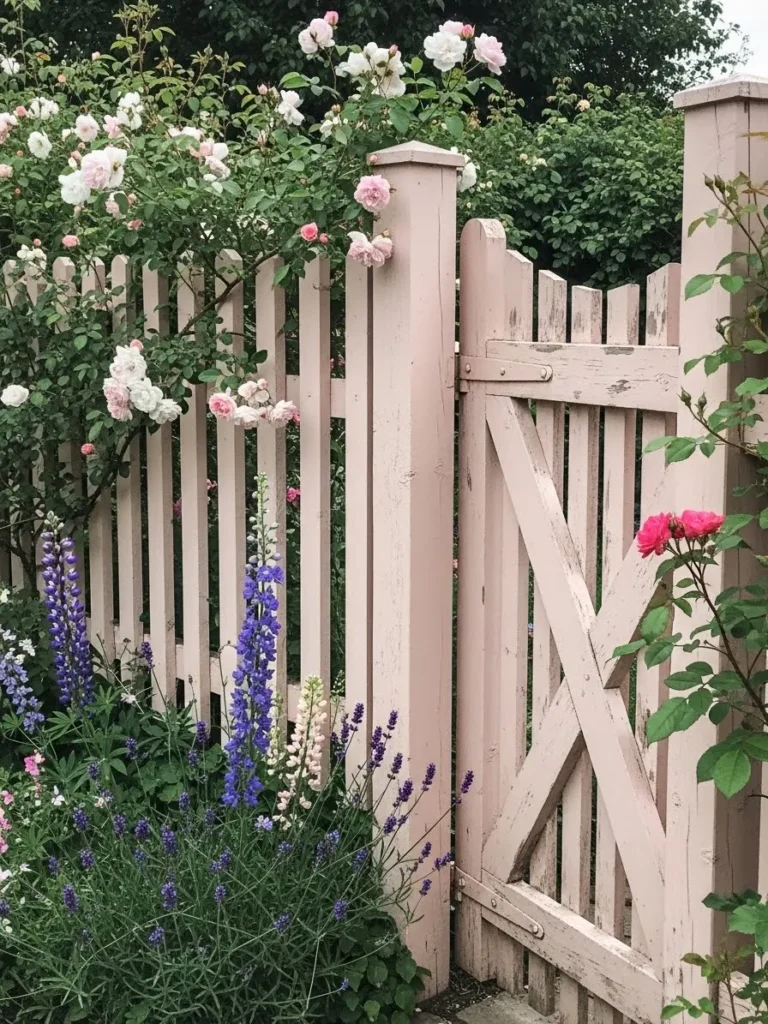 This fence includes a soft blush painted gate paired with vertical pickets and simple cross details. The paint shows light wear which adds charm and keeps it from feeling too new. Surrounding flowers and greenery grow freely around the gate creating a layered romantic look that feels straight out of a cottage dream.