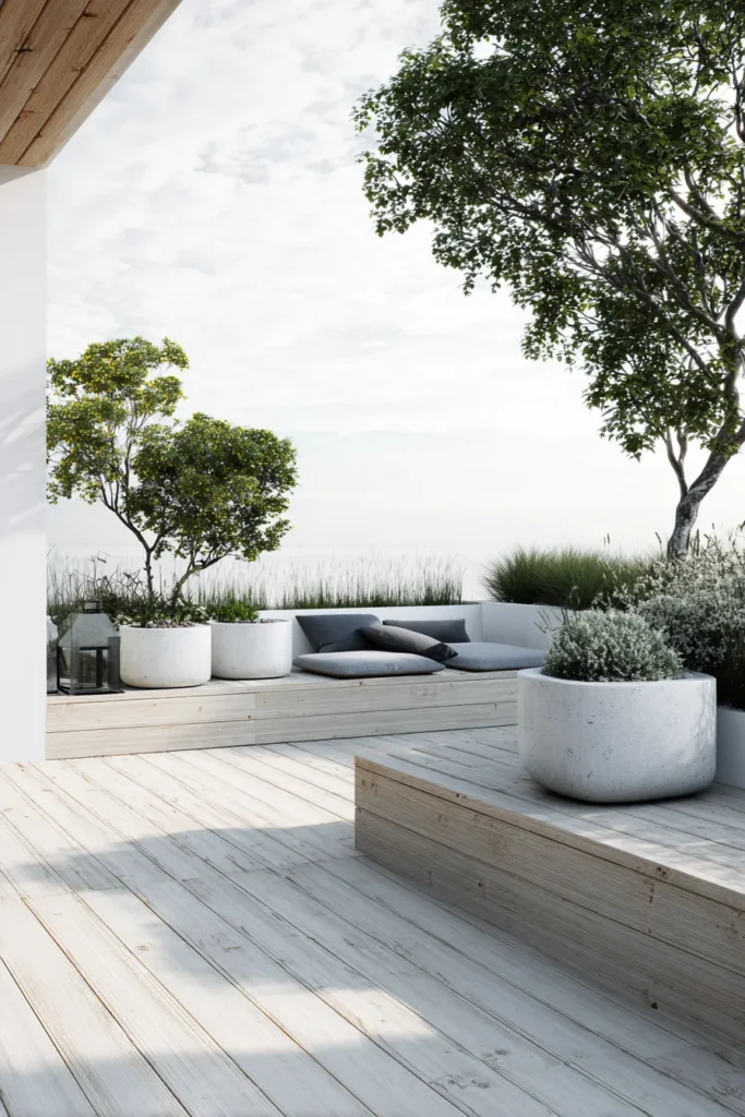 This design features a pale wood ground level deck paired with smooth white planters that hold small trees and greenery. The deck feels open and uncluttered, with plenty of breathing room between elements. Clean lines and soft natural tones give the space a fresh and modern look.