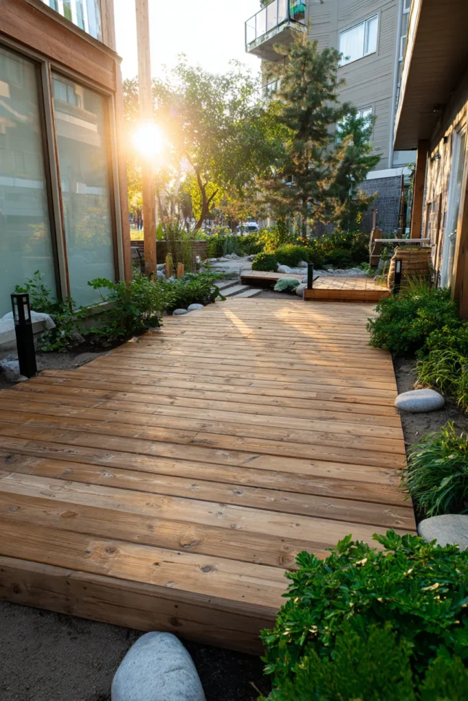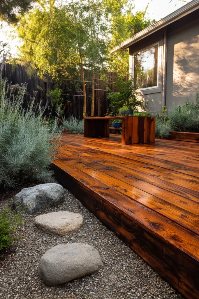 This small ground level deck sits neatly in a garden corner, built with weathered wood planks and surrounded by smooth stones and low plants. The deck feels solid and grounded, with natural textures adding warmth and depth. Sunlight filters through nearby trees, softening the entire scene.