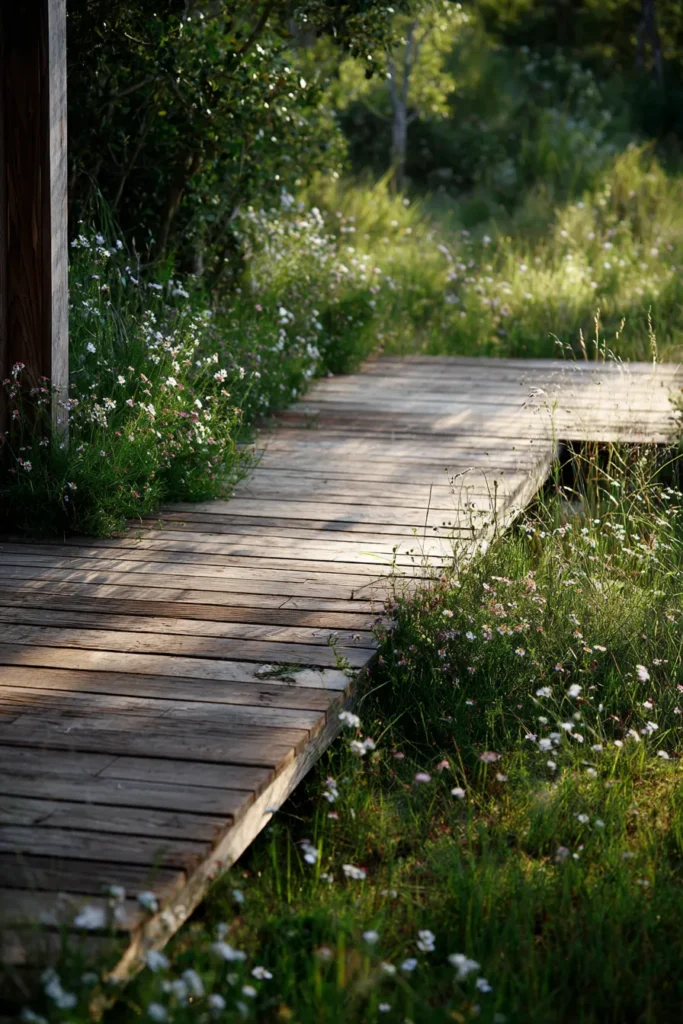 This ground level deck is surrounded by lush grasses and delicate plants, creating a natural meadow inspired setting. The wood planks sit low and blend effortlessly into the greenery, with no harsh borders or sharp transitions. Light filters through nearby plants, giving the area a gentle glow.