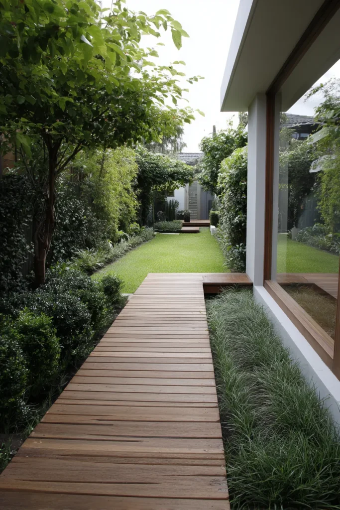 This deck features a slim wooden walkway placed directly beside the house, stretching through a narrow garden space. The planks are laid neatly, and dense greenery lines the edges, creating a peaceful corridor effect. The low height keeps everything grounded and approachable.