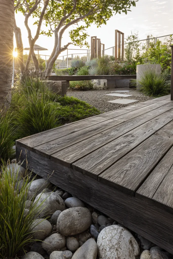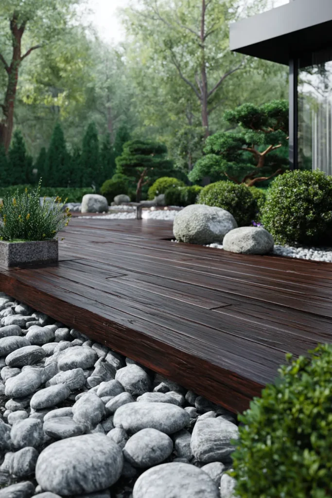 This ground level deck is made of rich dark wood planks that contrast beautifully with smooth white stones along the edges. The deck sits low and solid, surrounded by manicured greenery and natural textures. The darker tone adds depth while still keeping the design simple and grounded.