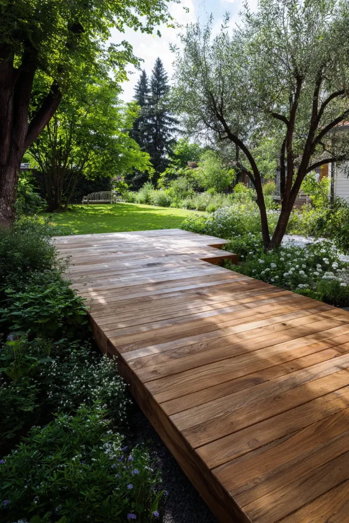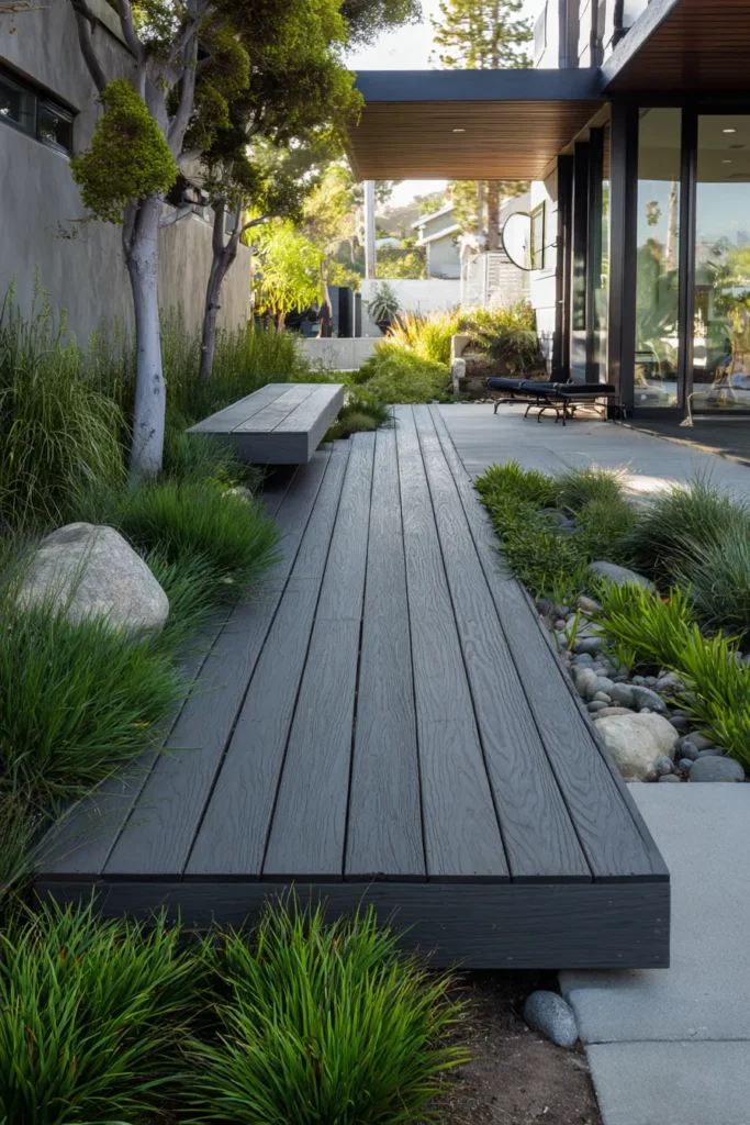 What I love here is how balanced it feels. The darker deck adds contrast, but the surrounding greenery keeps it from feeling heavy. It’s simple, elegant, and feels like a peaceful walk through your own private garden.
