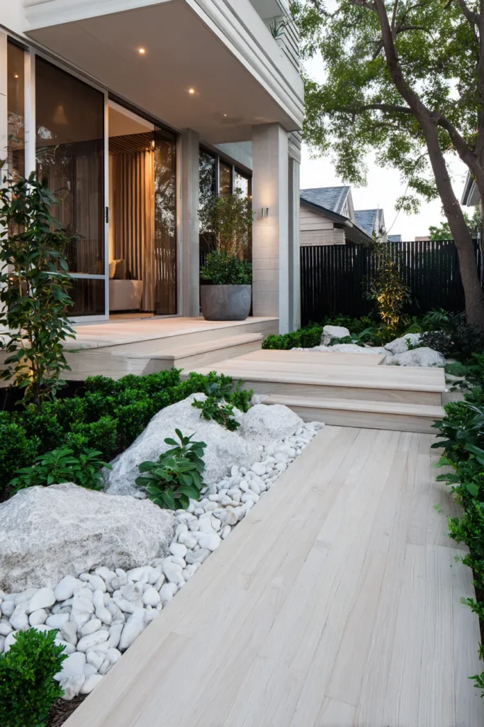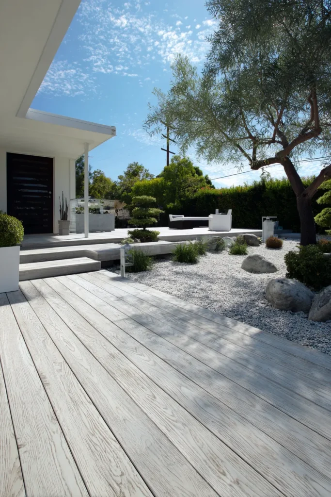 This ground level deck features light wood planks paired with crisp white stones and lush green planting along the edges. The deck connects seamlessly to the home, creating a smooth transition between indoors and outdoors. The color palette stays soft and airy, which makes the space feel open and refreshing.