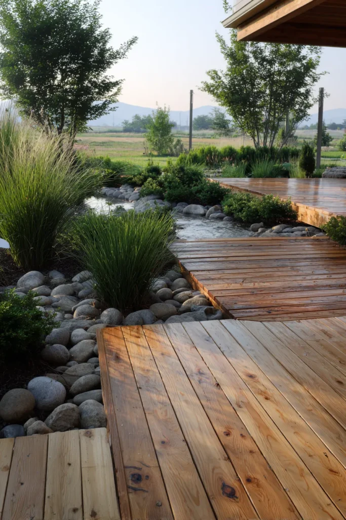This ground level deck features warm natural wood planks laid in a gentle curve that flows through smooth river stones and ornamental grasses. The deck sits flush with the surrounding landscape, creating a soft transition between greenery and walking space. Rounded stones, layered plants, and subtle changes in texture make the whole area feel organic and calm rather than structured or rigid.