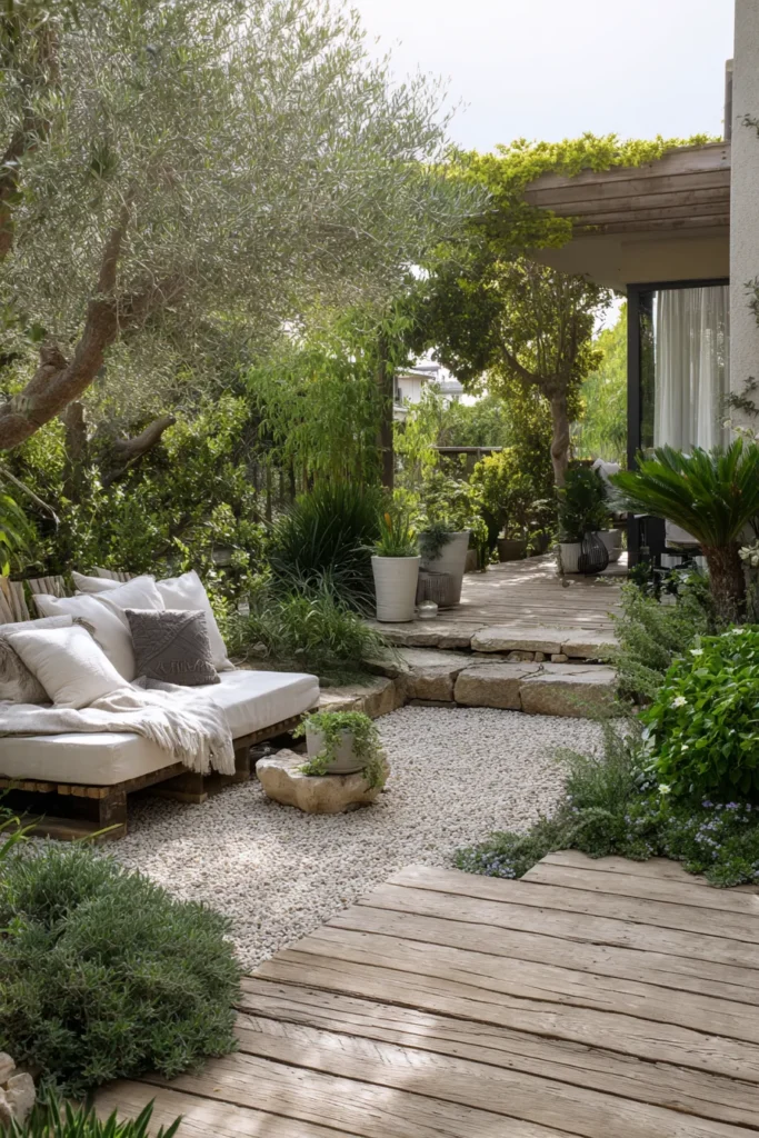 I really love how relaxed this design feels. It looks like the kind of place where you naturally slow down and stay a little longer. The balance of wood, gravel, and greenery makes it feel effortless and quietly beautiful.