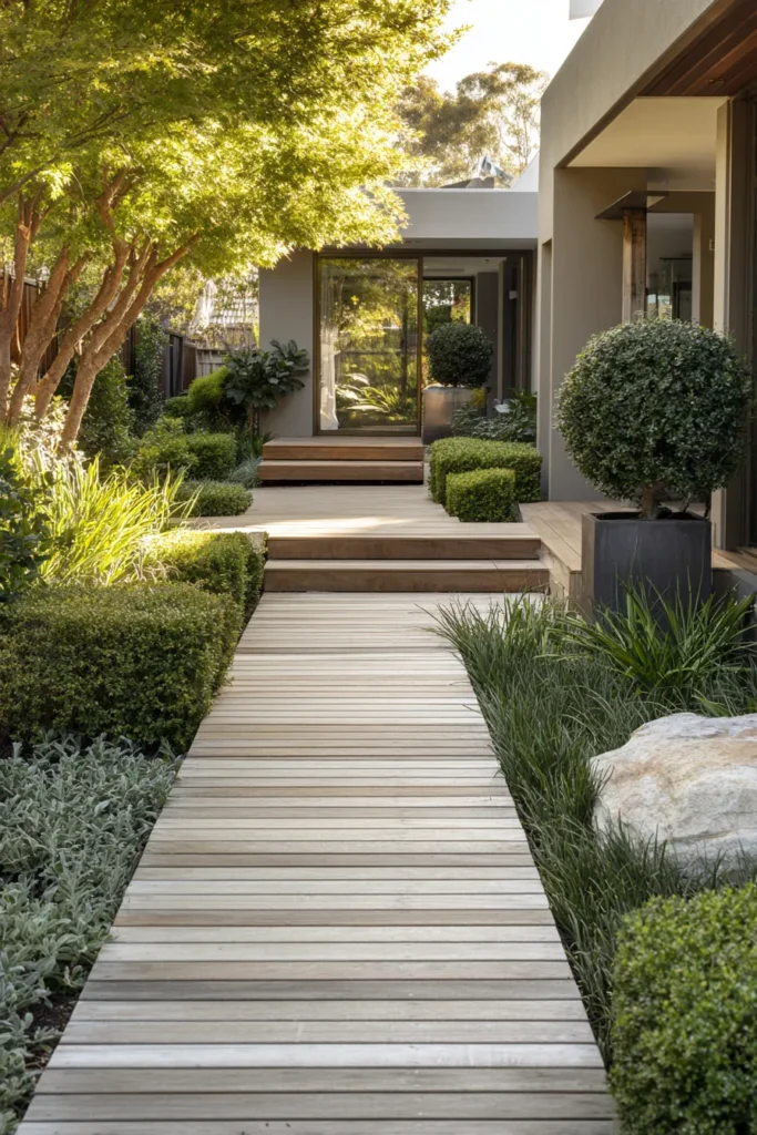 This design features a straight ground level deck walkway made of light wood planks that lead gently through a manicured garden toward the home. The edges are clean and simple, with soft shrubs and structured plants lining the path. Everything feels intentional while still staying calm and welcoming.