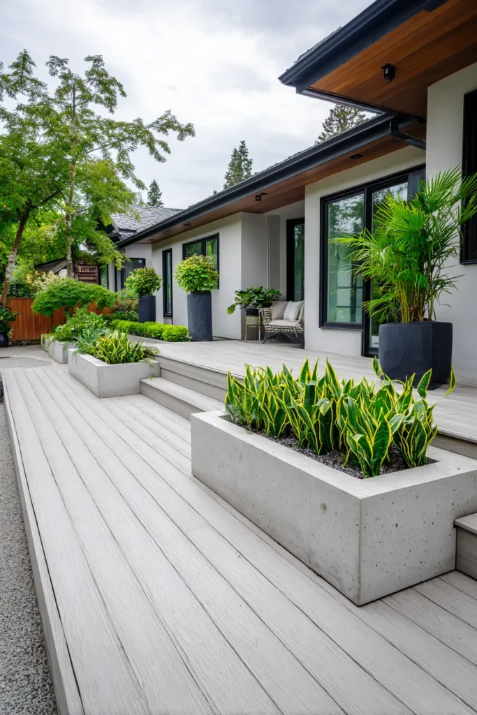 This sleek ground level deck uses light toned decking boards paired with clean concrete planters that line the edge of the home. The deck runs parallel to the house, creating a polished and modern walkway effect. Lush green plants soften the concrete and balance the straight lines, while the low profile keeps everything grounded and elegant.