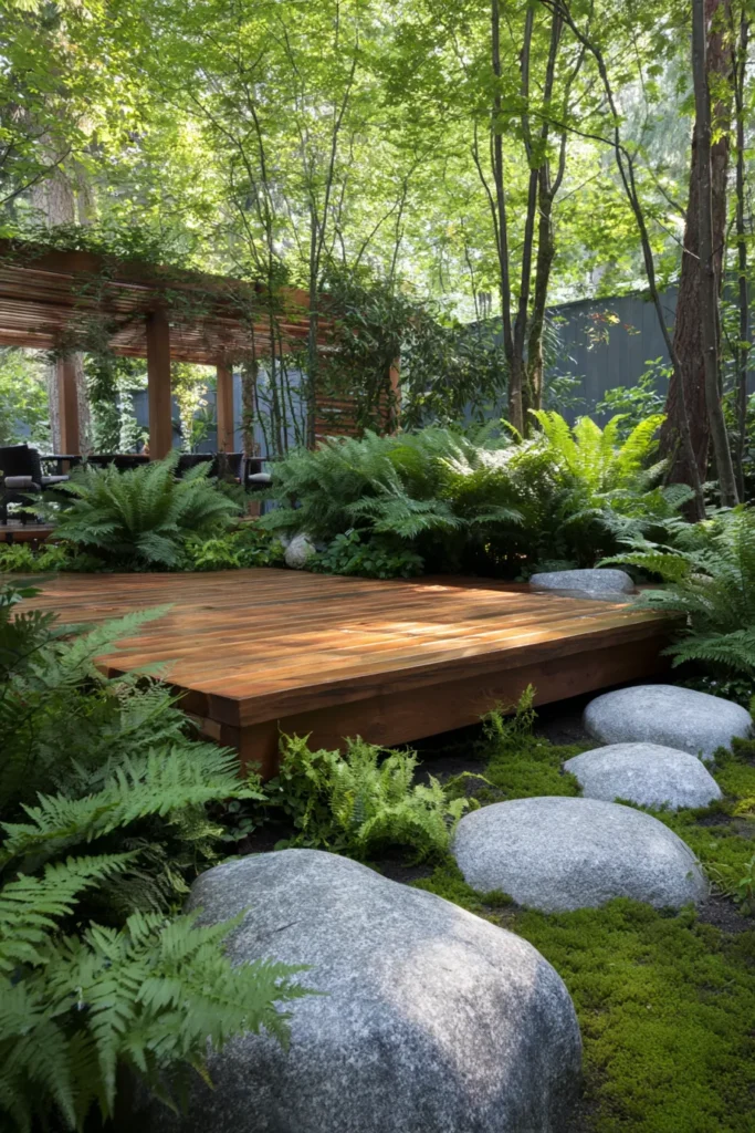 This deck is nestled into a wooded garden setting, built with warm wood planks that sit low among ferns, moss, and large natural stones. The edges are intentionally soft and organic, allowing plants to grow close and blur the line between deck and forest floor. Light filters through the trees, giving the space a quiet and grounded feel.