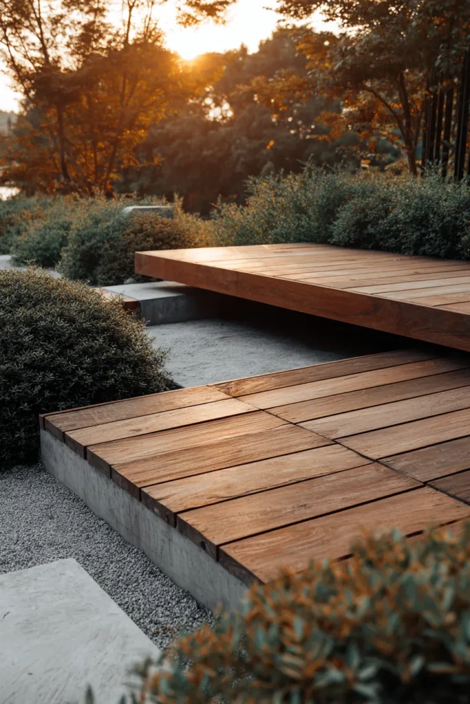 This ground level deck uses light wood planks arranged in gentle levels that follow the natural slope of the garden. Low steps connect each section smoothly, surrounded by gravel, shrubs, and carefully placed plants. The overall look is structured but still relaxed, with clean lines softened by greenery.