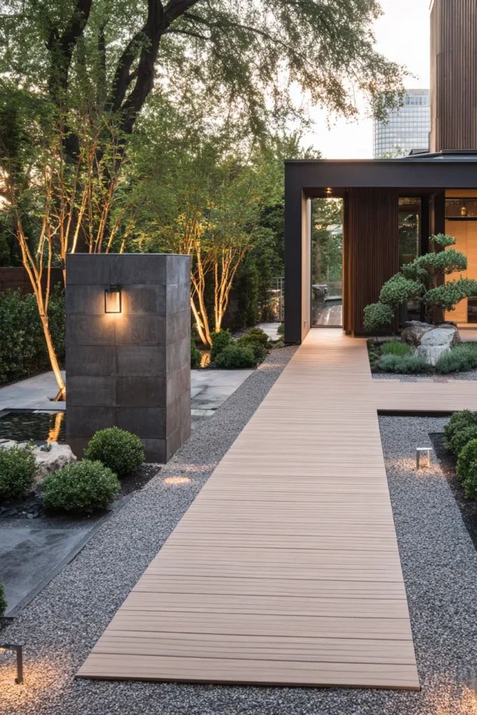 I really love how peaceful this design feels, especially with the soft glow along the walkway. It feels welcoming without trying too hard, and I can easily picture slow evening walks here when the day starts to wind down.