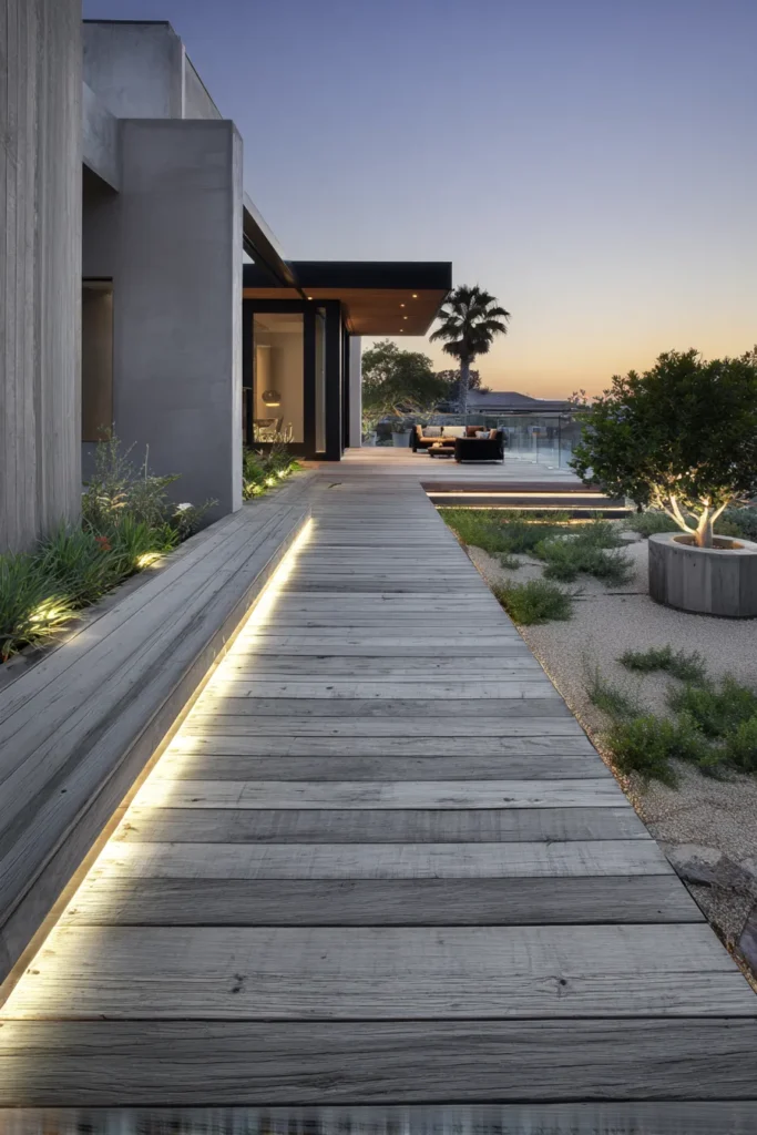 This ground level deck features light wood planks laid in a straight, clean line that gently guides you through a landscaped garden. Subtle built in lighting runs along the edges, softly illuminating the path without overpowering the surroundings. Gravel borders and sculpted greenery frame the deck, keeping everything calm, tidy, and visually balanced.