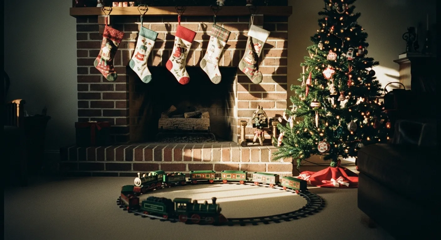 I absolutely love this kind of scene—it feels alive with holiday tradition. The stockings, the tree, even the toy train tell their own story. It’s the kind of living room where you’d sip cocoa and lose track of time while the fire crackles.