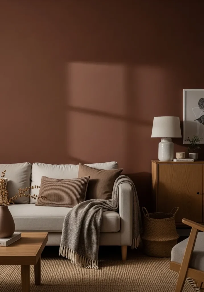 This wall color reads like a rich reddish brown, and it feels very close to Benjamin Moore Audubon Russet. It sits somewhere between brown and terracotta, with a soft warmth that doesn’t feel too heavy. You can see how it works against the light sofa and wood cabinet, giving the room a steady, comfortable base.
