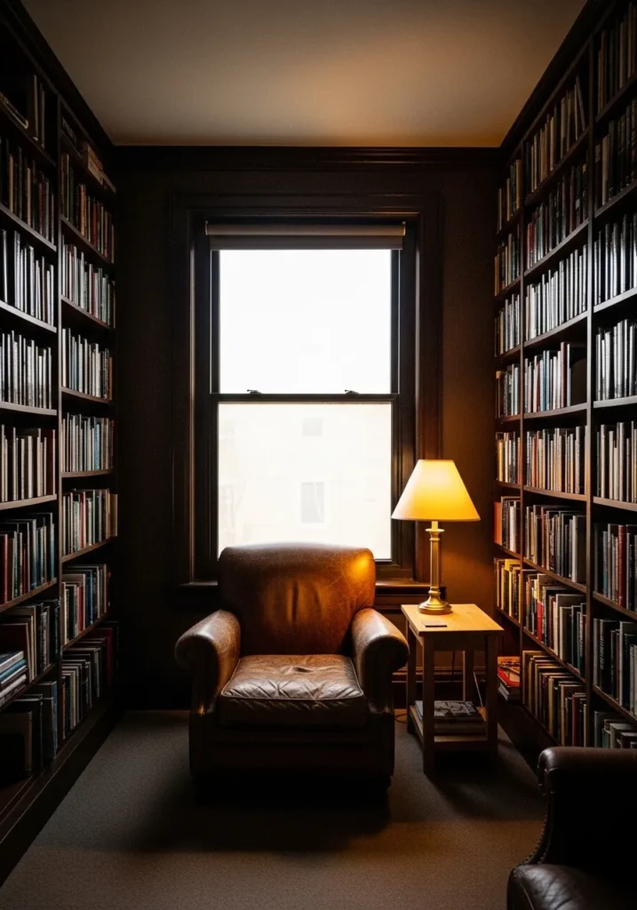 This wall color reads as a deep espresso brown, and it feels closest to Benjamin Moore Java. It is a very dark brown with a soft warmth that keeps it from looking flat or black. Around the built-in shelves and leather chair, it comes across rich but still familiar.