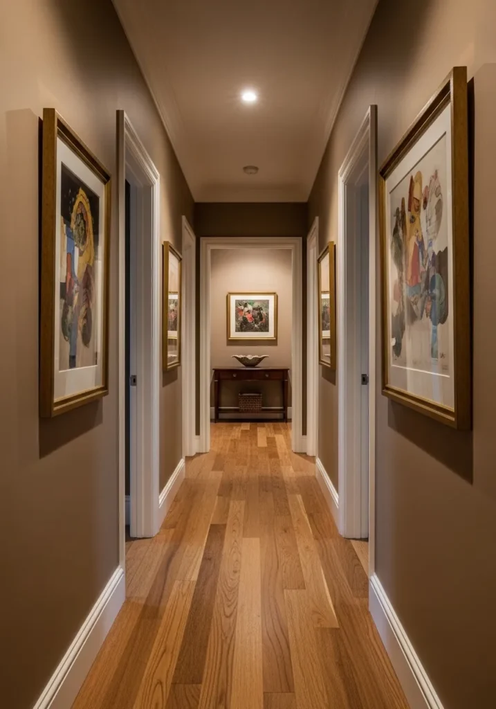 This wall color reads as a medium warm brown, and it feels very close to Benjamin Moore Davenport Tan. It has that balanced tone that sits comfortably between beige and deeper brown, so it feels steady without getting too dark. Along a hallway like this, it gives the walls a bit more presence without closing things in.
