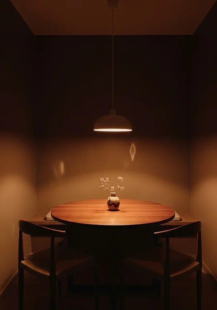 This wall color reads as a dark warm brown, and it feels closest to Benjamin Moore French Press. It is a deep, coffee-like brown that leans warm without turning too red, which gives it a quiet, enclosed feel. Around a small table like this, it makes the space feel more defined and a bit tucked away.