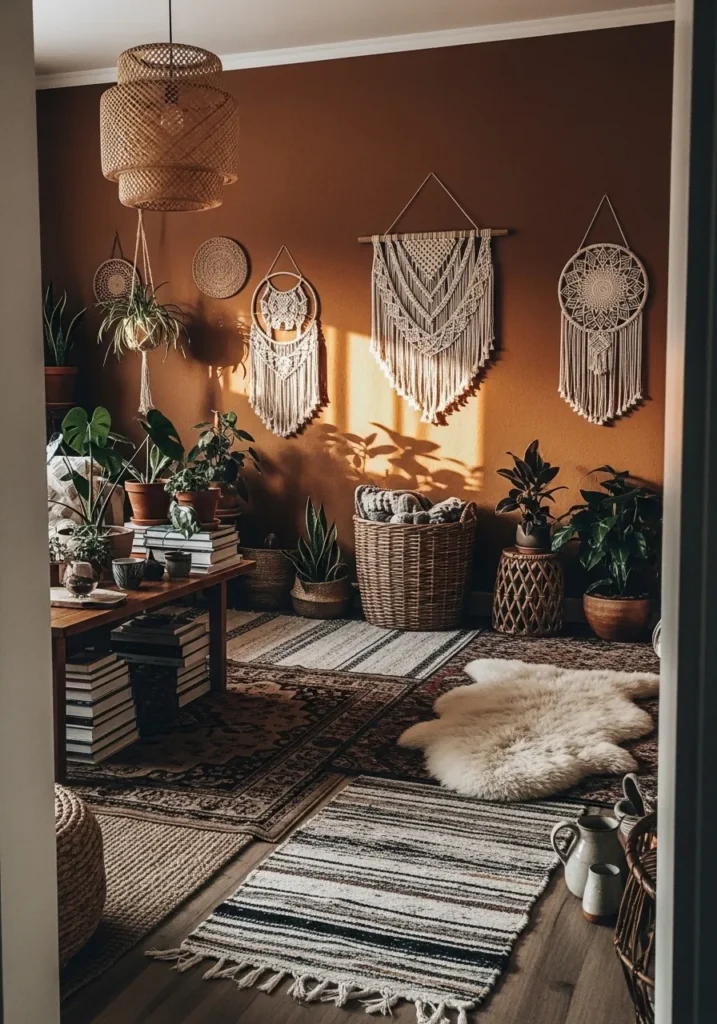 This wall color reads as a warm clay brown, and it feels closest to Benjamin Moore Potters Clay. It has that mix of brown and muted orange that gives it a soft, earthy feel without looking too bold. Around the woven wall hangings and plants, it blends in naturally and feels easy to build around.