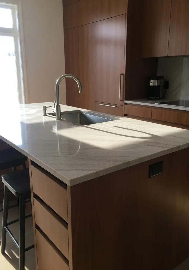 The undertone leans warm with a slight reddish base, which keeps it from going flat or gray. It works well in kitchens with good daylight, where it can show some variation across the surface. Paired with light stone and simple hardware, it stays balanced and easy to use every day.