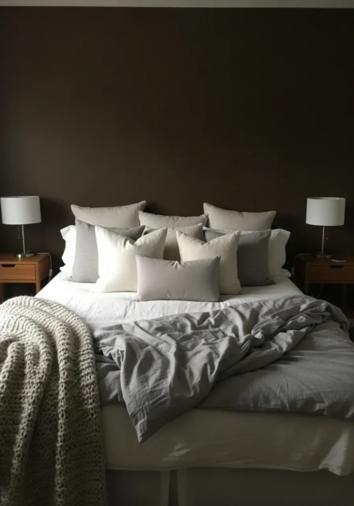 This wall color reads as a dark coffee brown, and it feels closest to Benjamin Moore French Roast. It is a deep, warm brown that sits just shy of black, which gives it a strong presence without looking flat. Behind the bed and light bedding, it creates a clear contrast that feels simple and steady.