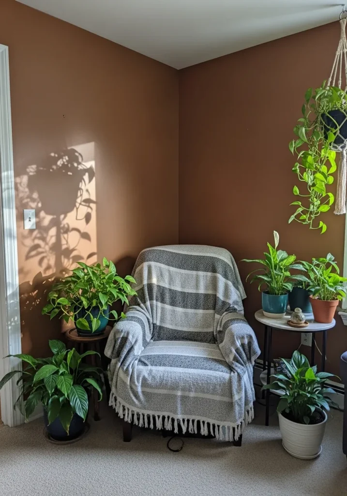 This wall color reads as a warm reddish brown, and it feels closest to Benjamin Moore Rust. It has that earthy brown base with a noticeable red tone, which gives it a bit more life than a standard brown. Around the plants and simple chair, it feels relaxed and easy to sit with for a while.