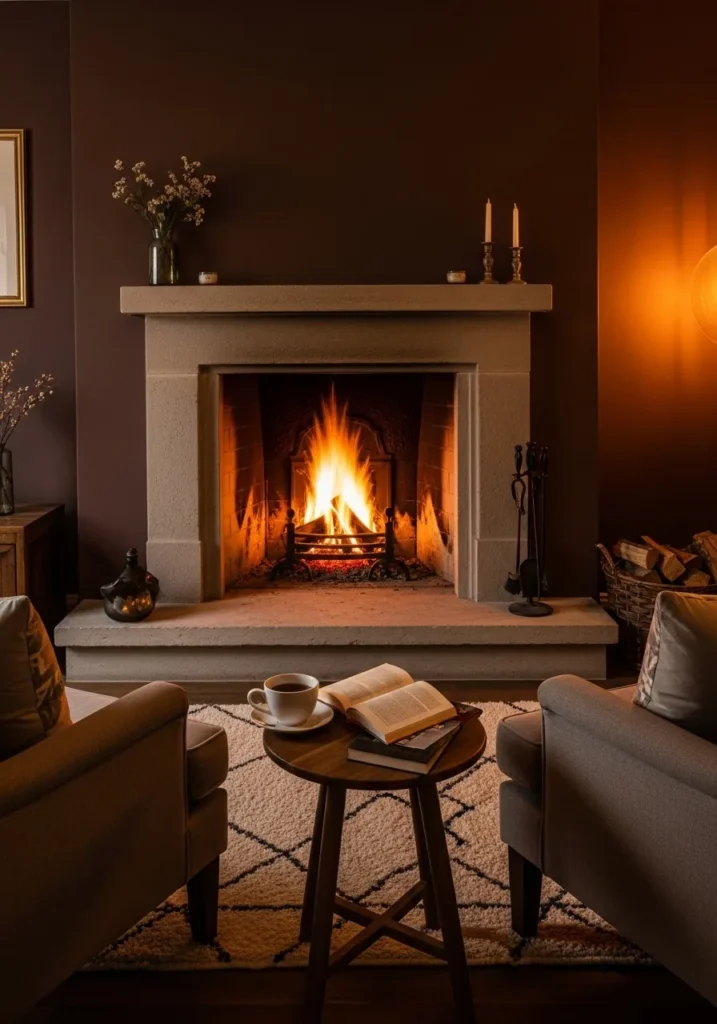 This wall color reads as a deep chestnut brown, and it feels closest to Benjamin Moore Mink. It sits between brown and a soft reddish tone, which gives it a fuller look than a flat dark color. Around a fireplace like this, it feels steady and a bit traditional in a good way.