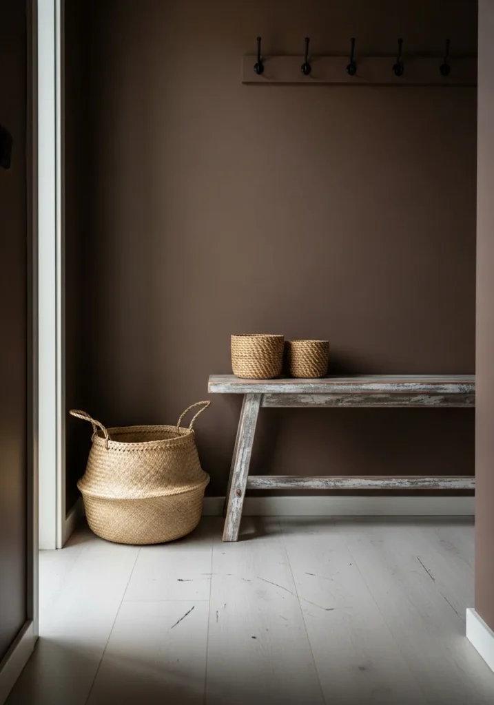 This wall color reads as a soft warm brown, and it feels very close to Benjamin Moore Davenport Tan. It sits in that easy middle range where brown meets a bit of beige, so it feels relaxed instead of heavy. Next to the woven baskets and light wood bench, it looks natural and lived-in without trying too hard.