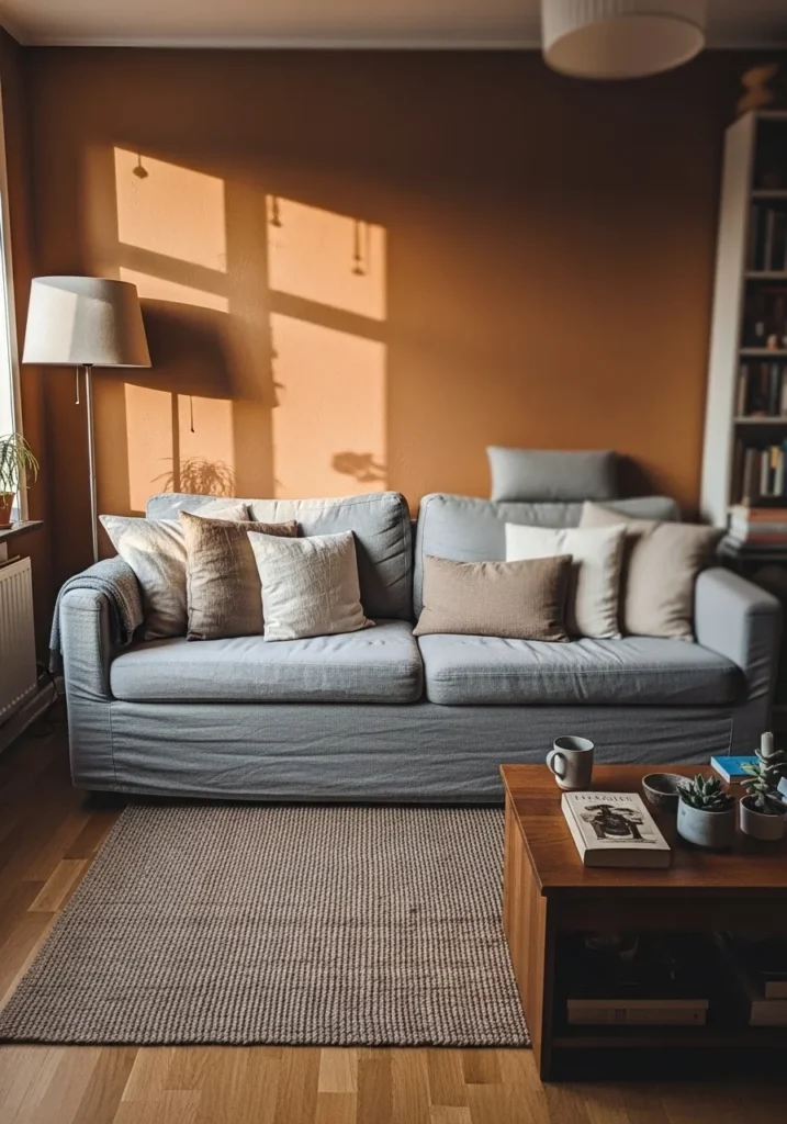 This wall color reads as a warm terracotta brown, and it feels very close to Benjamin Moore Potters Clay. It sits between brown and muted orange, which gives it a soft, sun-worn look instead of a heavy one. Next to the gray sofa and simple wood table, it comes across relaxed and easy to settle into.