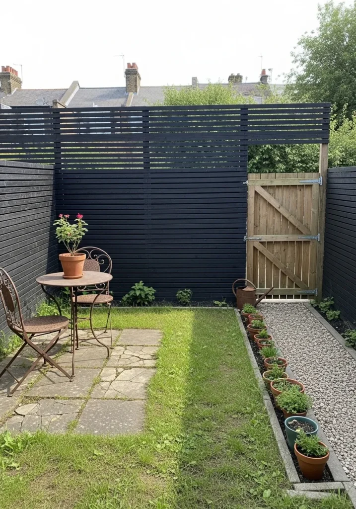 This backyard features a dark stained slatted wood fence paired with a charming wooden gate. The horizontal slats create full coverage, while the slightly deeper tone gives the space a cozy cottage feel. A small paved patio and neat rows of potted plants line the fence, adding color and softness against the darker wood. The overall layout feels practical and thoughtfully arranged.