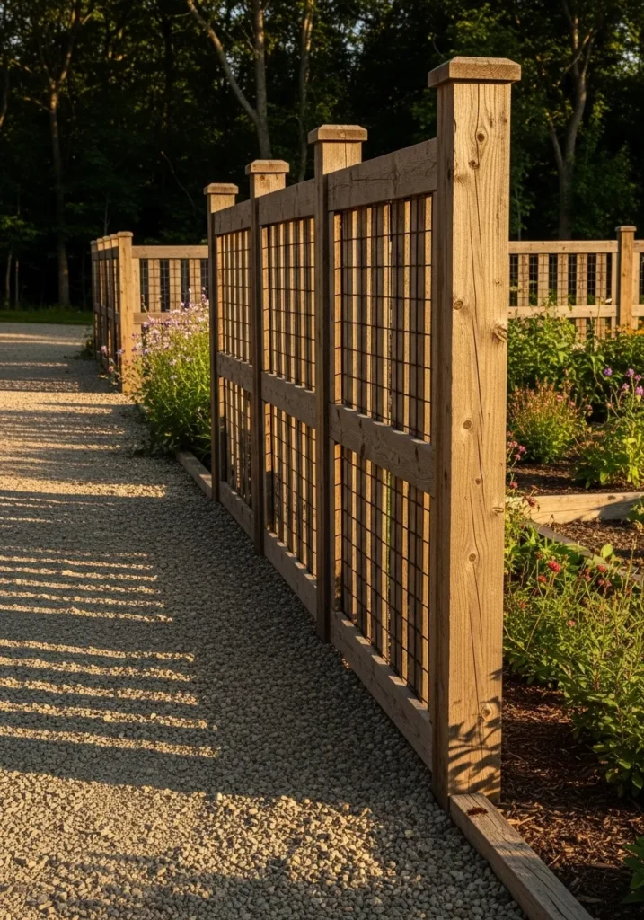 This fence design combines solid wooden posts with framed lattice style panels in between. The square grid pattern adds texture and visual interest without blocking all light. The natural wood tone ties beautifully into the surrounding landscape, while the sturdy posts create a strong and dependable boundary. The pathway alongside the fence feels calm and welcoming.