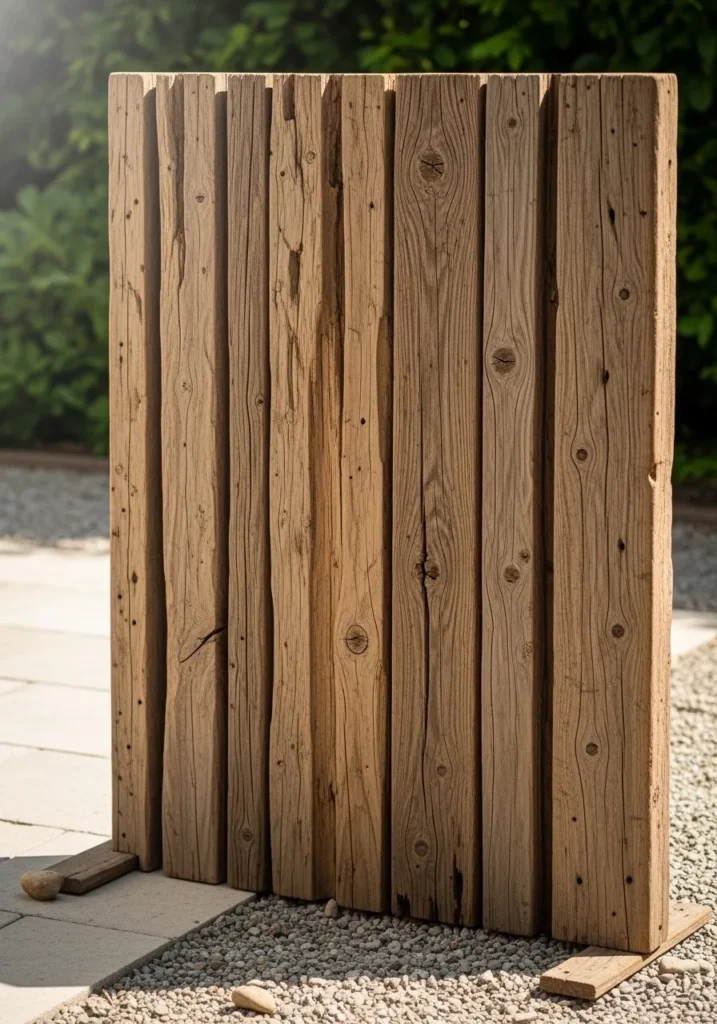 This freestanding wood panel is made from tightly placed vertical planks with visible knots and natural imperfections. The boards vary slightly in width and tone, which gives it a handcrafted and organic vibe. Positioned on a patio with gravel and stone details, the screen works beautifully as a movable divider that can define different outdoor zones. Its compact footprint makes it practical for smaller spaces.
