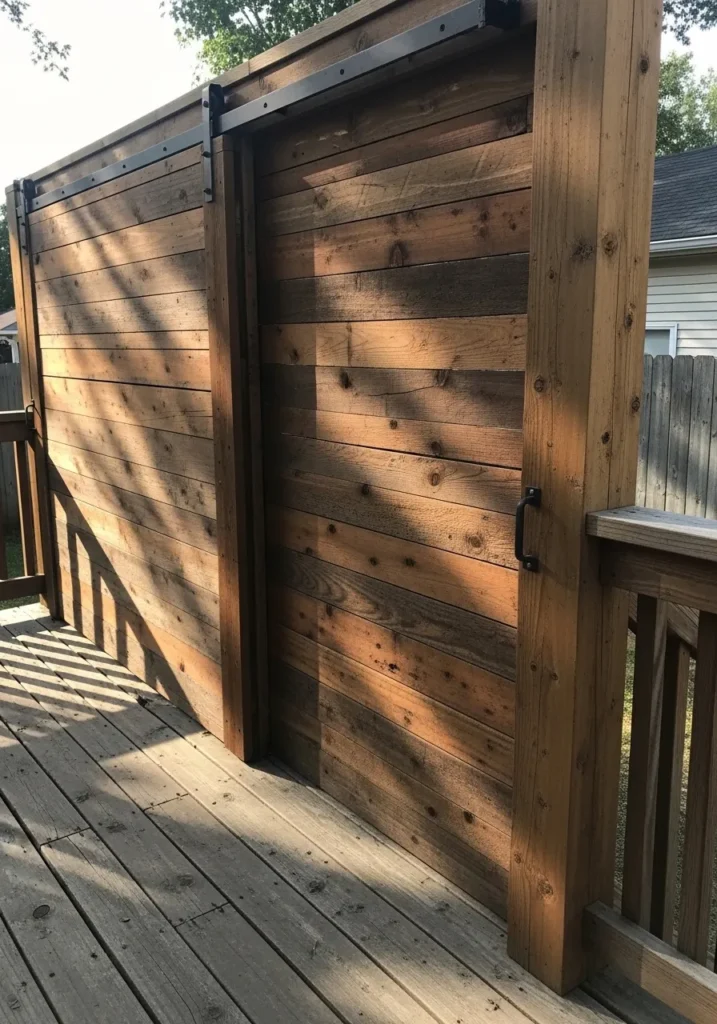 This rich, dark stained wood screen is framed with thick beams and designed to slide along a track, making it both functional and visually striking. The deep brown tones highlight the wood grain and create dramatic shadows in the sunlight. The structure feels solid and architectural, especially against the lighter decking beneath it. It adds a sense of depth and separation without overwhelming the space.