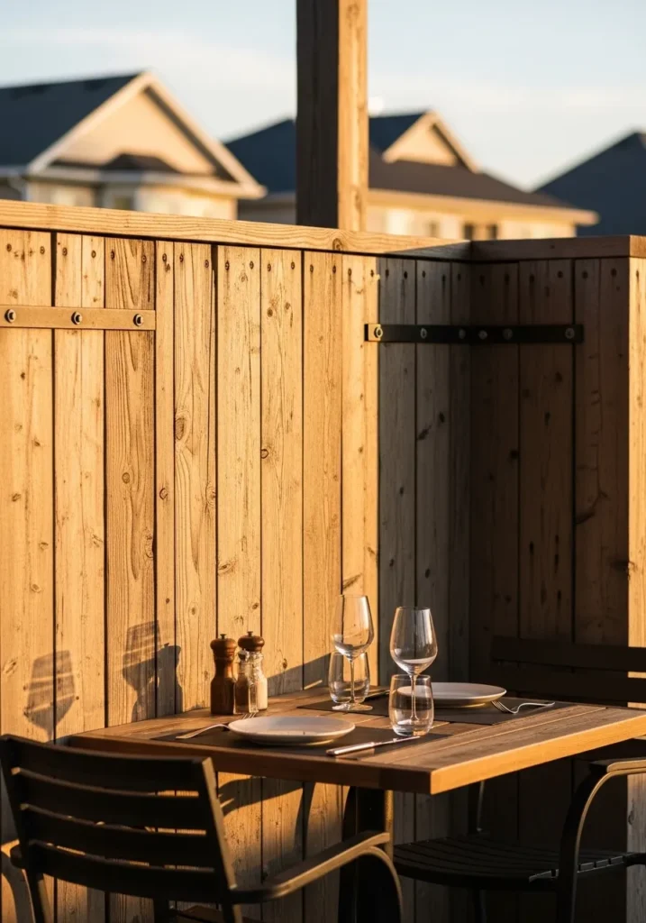 This design showcases tall vertical wood planks in a rich honey tone that catch the sunlight beautifully. The boards are evenly spaced and framed with darker hardware for a sturdy, grounded feel. Inside the fenced area, a simple wooden table set for dinner reflects the same warmth as the surrounding panels. The clean structure keeps the look neat, while the natural wood grain adds just the right amount of rustic personality.