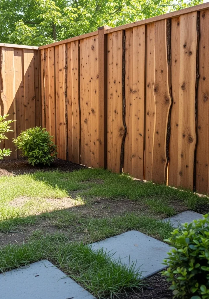 Here, a tall cedar fence lines the backyard with evenly spaced vertical boards and subtle variations in color. The natural knots and wood texture are visible, which gives it that true rustic character. A small strip of grass and a few shrubs soften the base of the fence, while stepping stones lead across the yard. The fence provides full privacy without feeling harsh or overly industrial.