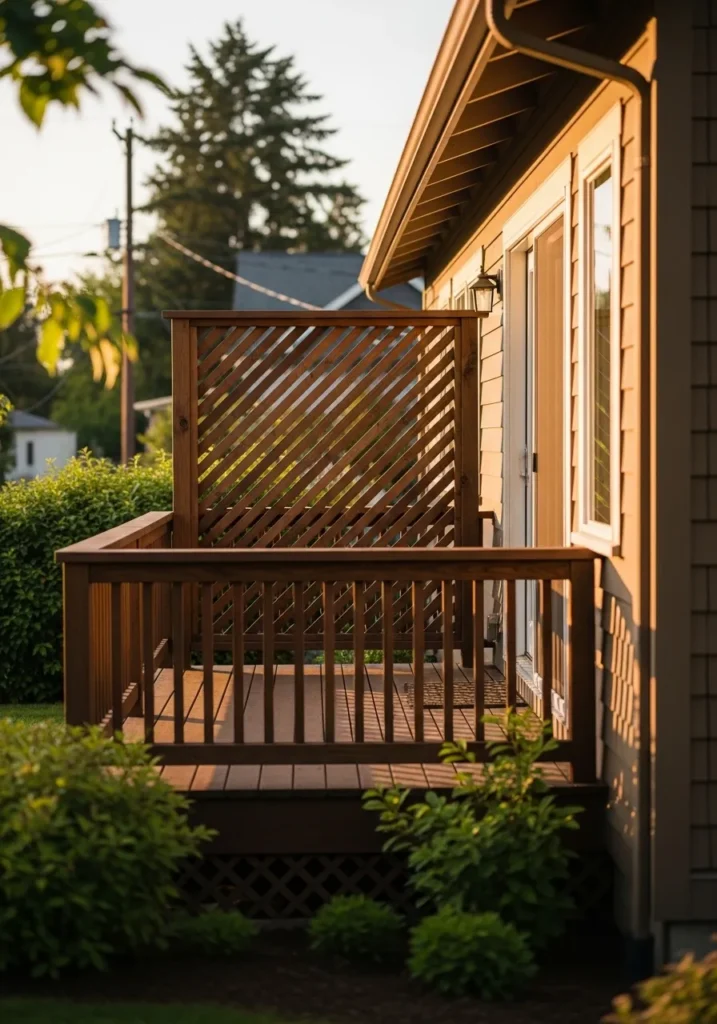 This charming deck features a wooden railing paired with a diagonal lattice privacy panel that adds both coverage and visual interest. The lattice design allows a hint of light to filter through while still creating separation from nearby homes. The matching wood tones tie the deck and privacy screen together, and the surrounding greenery makes the space feel tucked away. The structure feels solid and thoughtfully built.