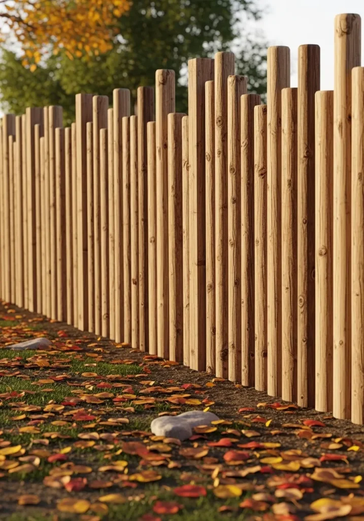 This fence stands out with its rounded vertical wood posts that resemble natural logs lined up side by side. The varying heights of the tops add a playful, handcrafted feel while still offering strong privacy coverage. Fallen leaves along the ground enhance the rustic atmosphere and highlight the warm tones of the wood. The texture and organic shape of each post make the fence feel connected to nature.