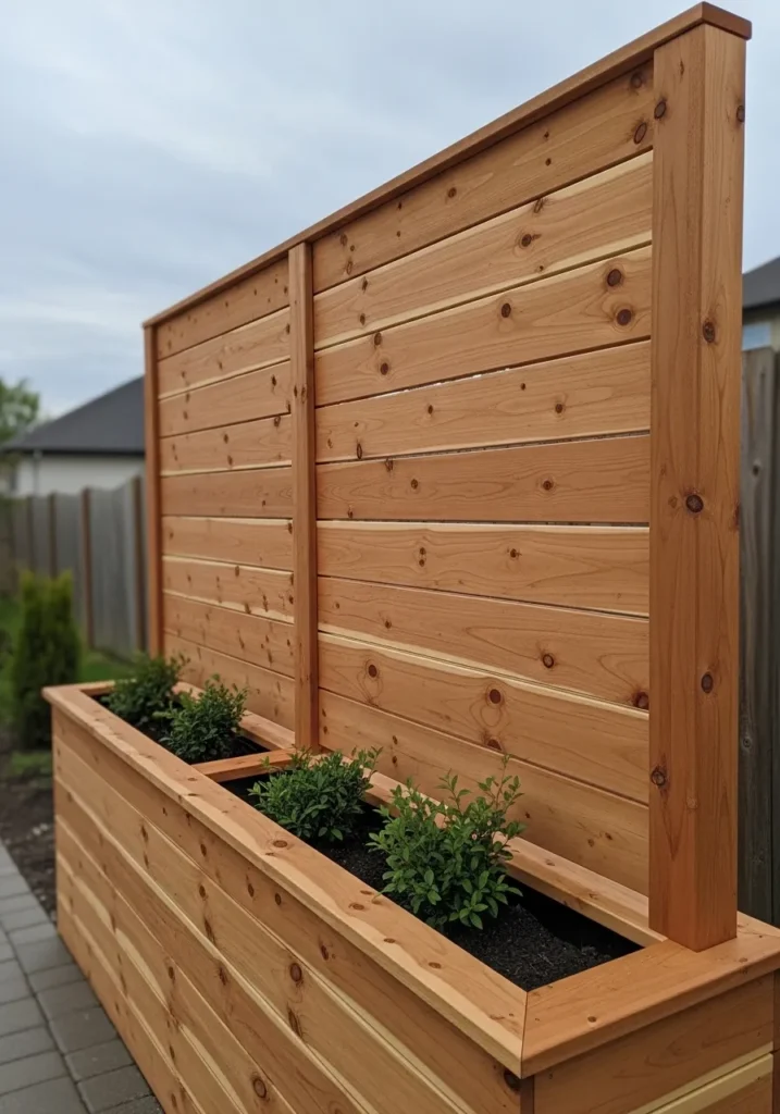 This privacy screen combines tall horizontal cedar planks with a matching raised planter at the base. The clean lines and smooth wood finish give it a fresh rustic look that feels both sturdy and stylish. Small green plants tucked into the planter soften the solid wood wall and add a lovely contrast against the warm tones. The overall structure feels practical, yet carefully designed to elevate a simple backyard.